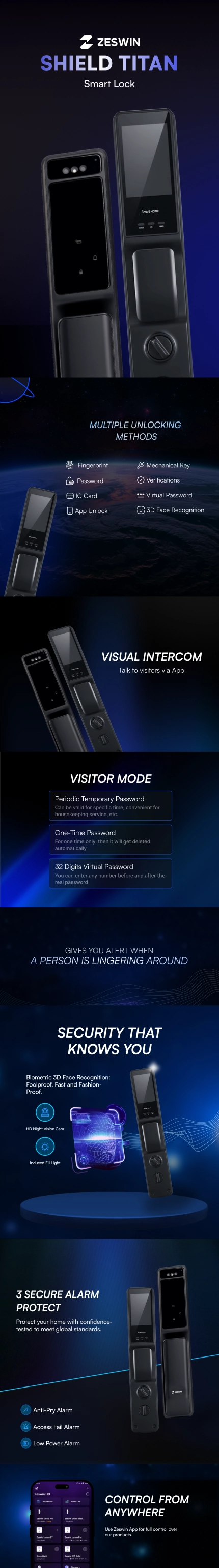 3D Face Recognition Lock, Biometric Fingerprint Lock, PIN/Keypad Lock, IC Card Lock, Mechanical Key Backup, Mortise Smart Lock