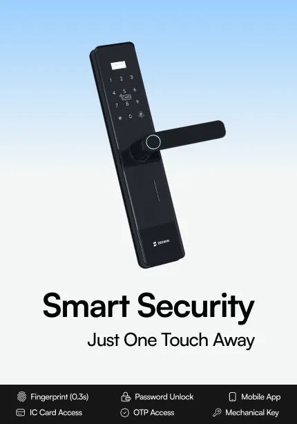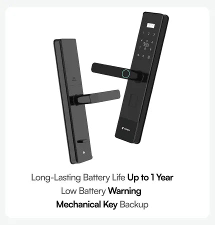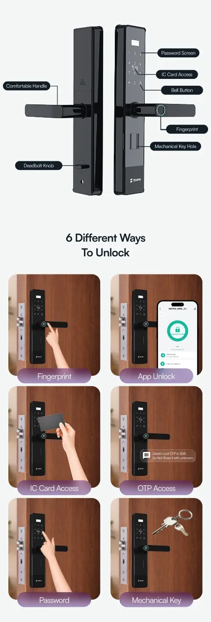 • Multiple unlock options: Fingerprint, PIN, App, OTP, RFID Card & Mechanical Key